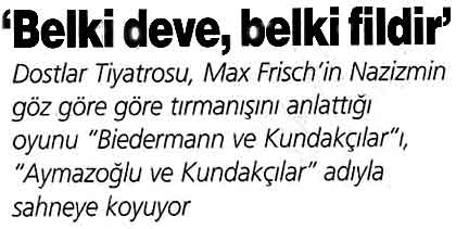 Bugünün, yani 2000'li yılların Aymazoğlu'su sanırım 90'larınkiyle aşık atıyor. 90'lı yıllarda ona şurada burada, arada bir rasladığımızda, kimi kez başımızı çeviriyor, kimi kez de bir tepki gösteriyorduk. Bugün ise öylesine şişti, yayıldı ve yaşamımızın doğal bir parçası haline geldi ki, onu görmüyoruz bile. Önümüz arkamız, sağımız solumuz Aymazoğlu'larla dolu. Günlük yaşamın hay huyu içinde sokakta, evde, televizyonda her an, her dakika karşımızda. Öyleyse o kim? Eline fırsat geçtiğinde insanları ölesiye ezip hırpalayan, korkutulunca da, en küçük tehlike karşısında sinip sönüveren otoriter kişiliğinde acaba kimi görüyoruz? Ya giderek üreyen, çoğalan Kundakçılar'ı yaratan, üreten kim? Demokrasinin bir türlü yeterince yeşeremediği bir toplumun Aymaz'ı nasıl biri, kucak açtığı Kundakçılar hangi güçlerin sözcüleri? Kim Aymazoğlu, içimizden biri mi, yoksa birileri mi, yoksa yoksa.... Biz kendimiz miyiz? Başka bir deyişle hepimizin içinde ondan bir şeyler yok mu? Bu sorular bu oyunla metnin soyut yapısını bozmadan yeniden hesaplaşmayı, metni yeni bir gözle okumayı ve yorumlamayı, kısaca oyunu günümüz Türkiye'sine taşımayı neredeyse zorunlu kılıyor. Bu açıdan yıllardır bu oyunun yaşadığımız ortam ve koşullara nasıl uyarlanabileceği üzerinde düşünen, metni durup durup yeniden eline alıp okuyan Genco Erkal'ın, sonunda bu oyunu sahnelemeye ve oynamaya bugün karar vermiş olması da rastlantı değil.