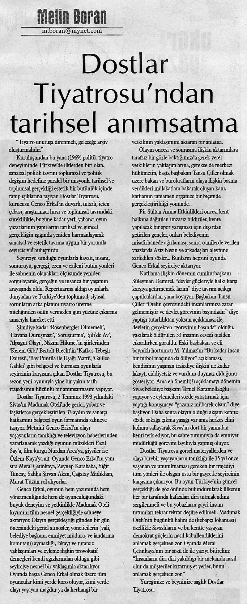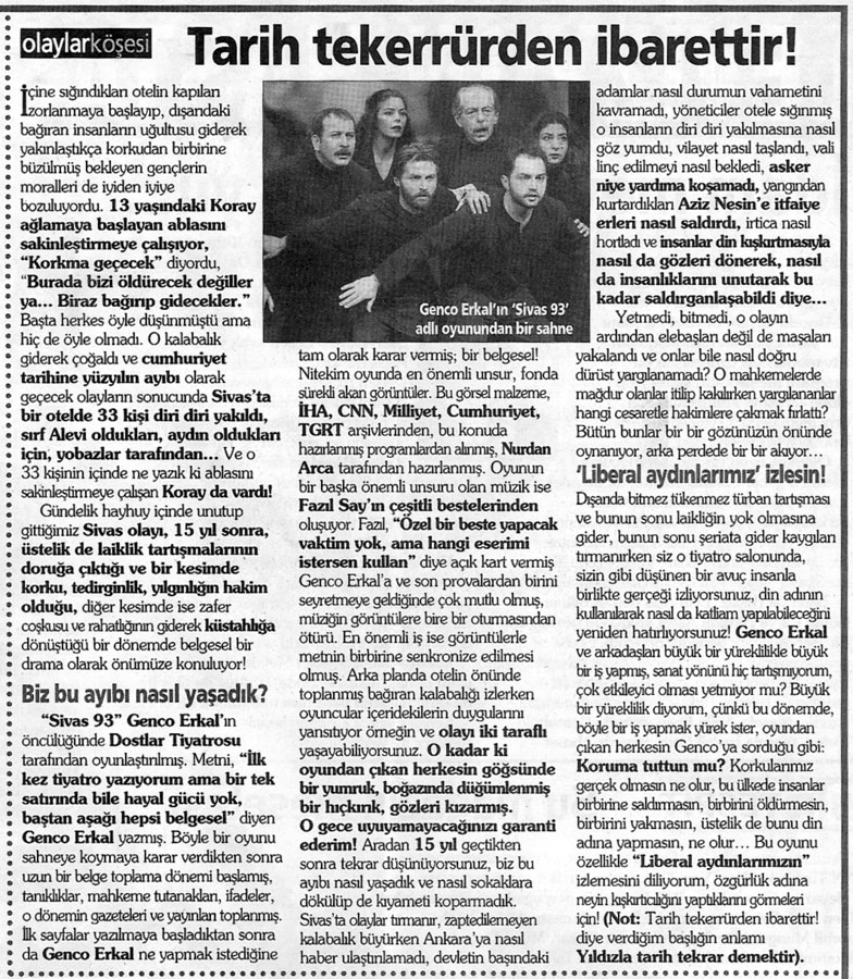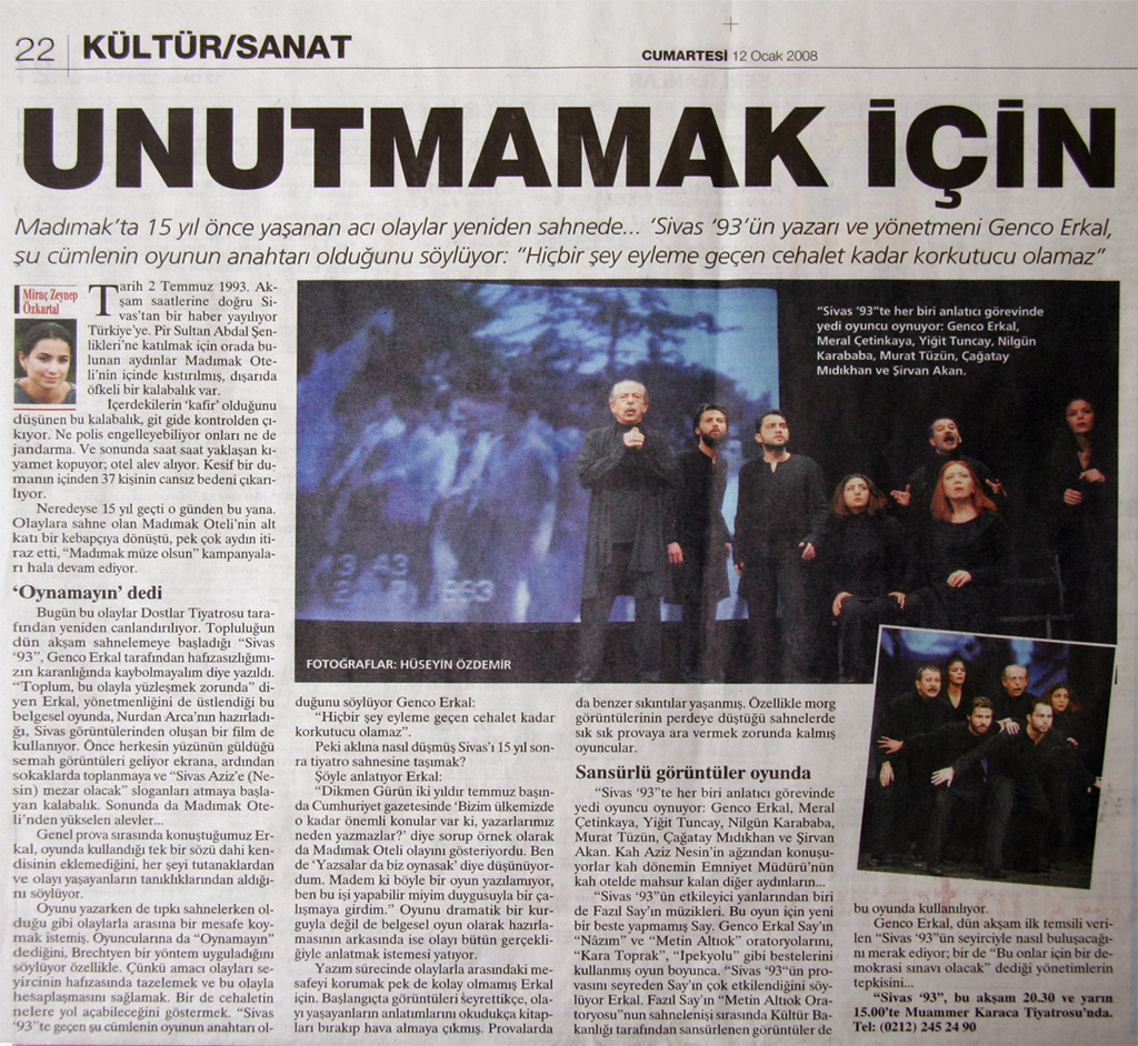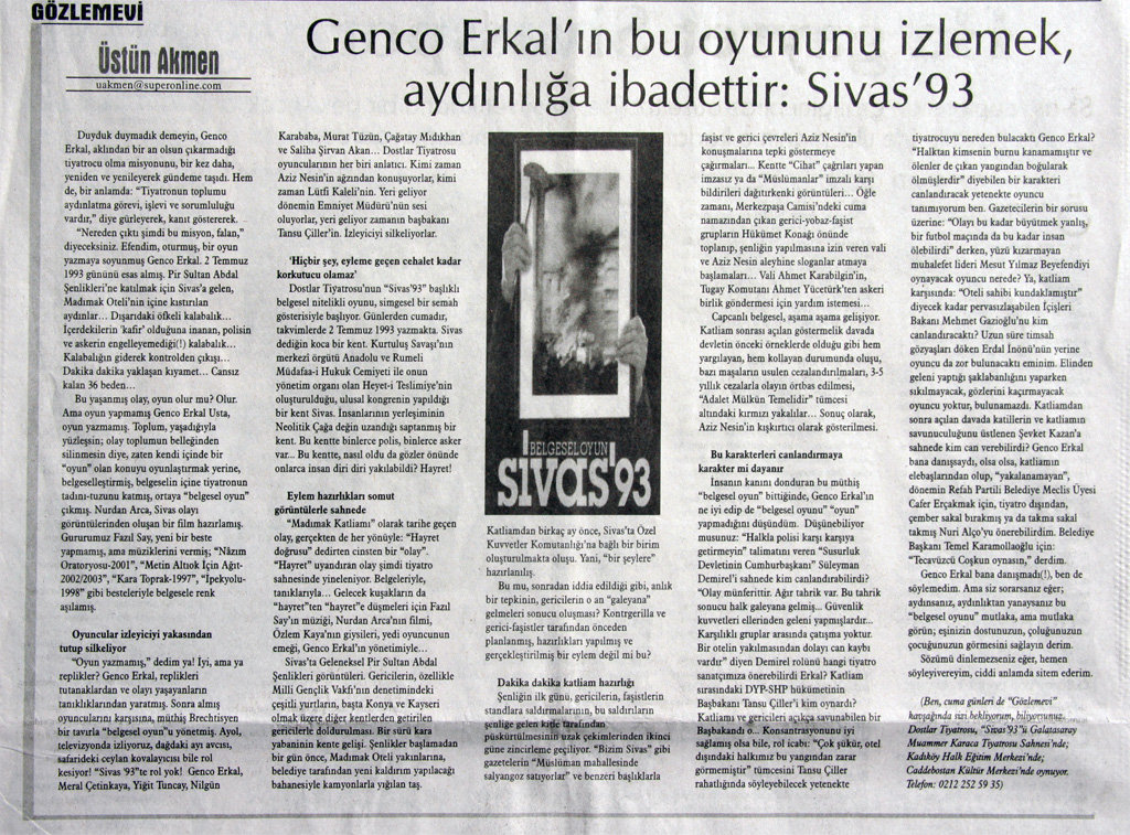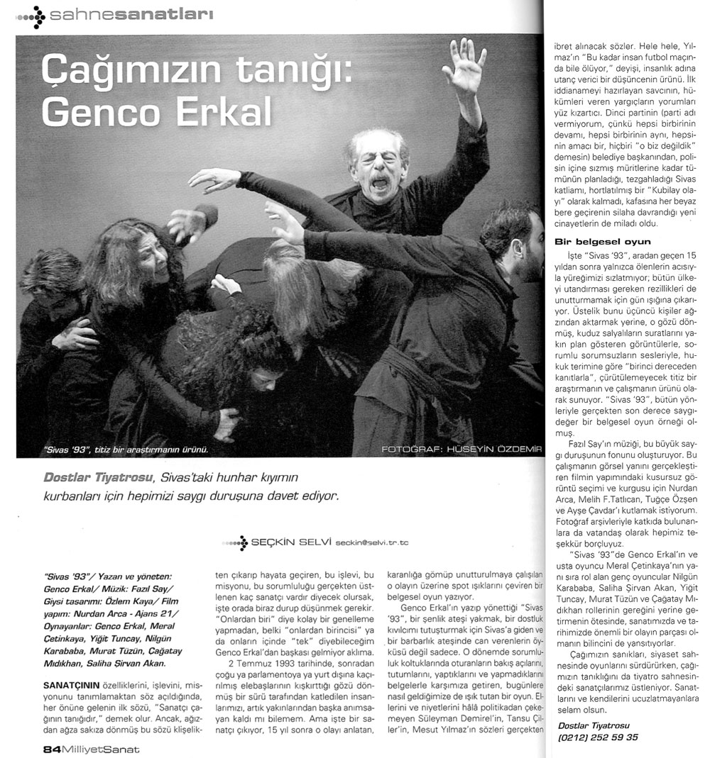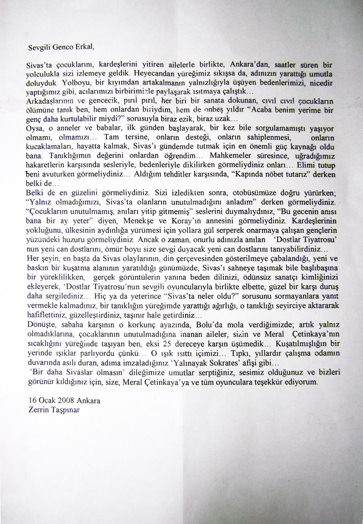 Sn. Genco Erkal nezdinde tüm sanatçılar; Dün akşam CKM’ de Sivas ’93 adlı belgesel oyununuzu izledim. Çok kısa yazacağım. Bize bu “korkunç” geceyi yaşattığınız için teşekkürler! Unutturmadığınız için, unutturmamaya çalıştığınız için… Saygılarımla;