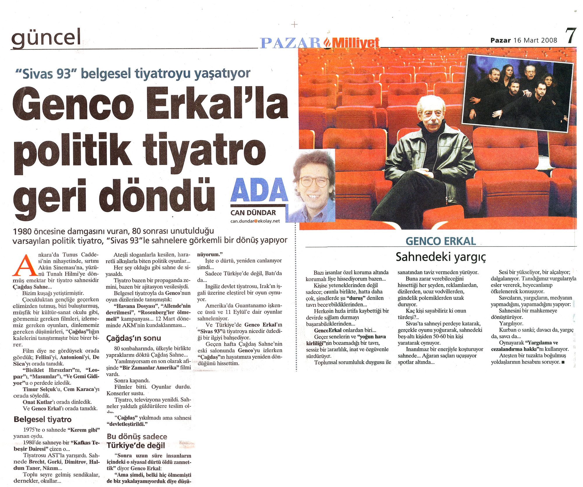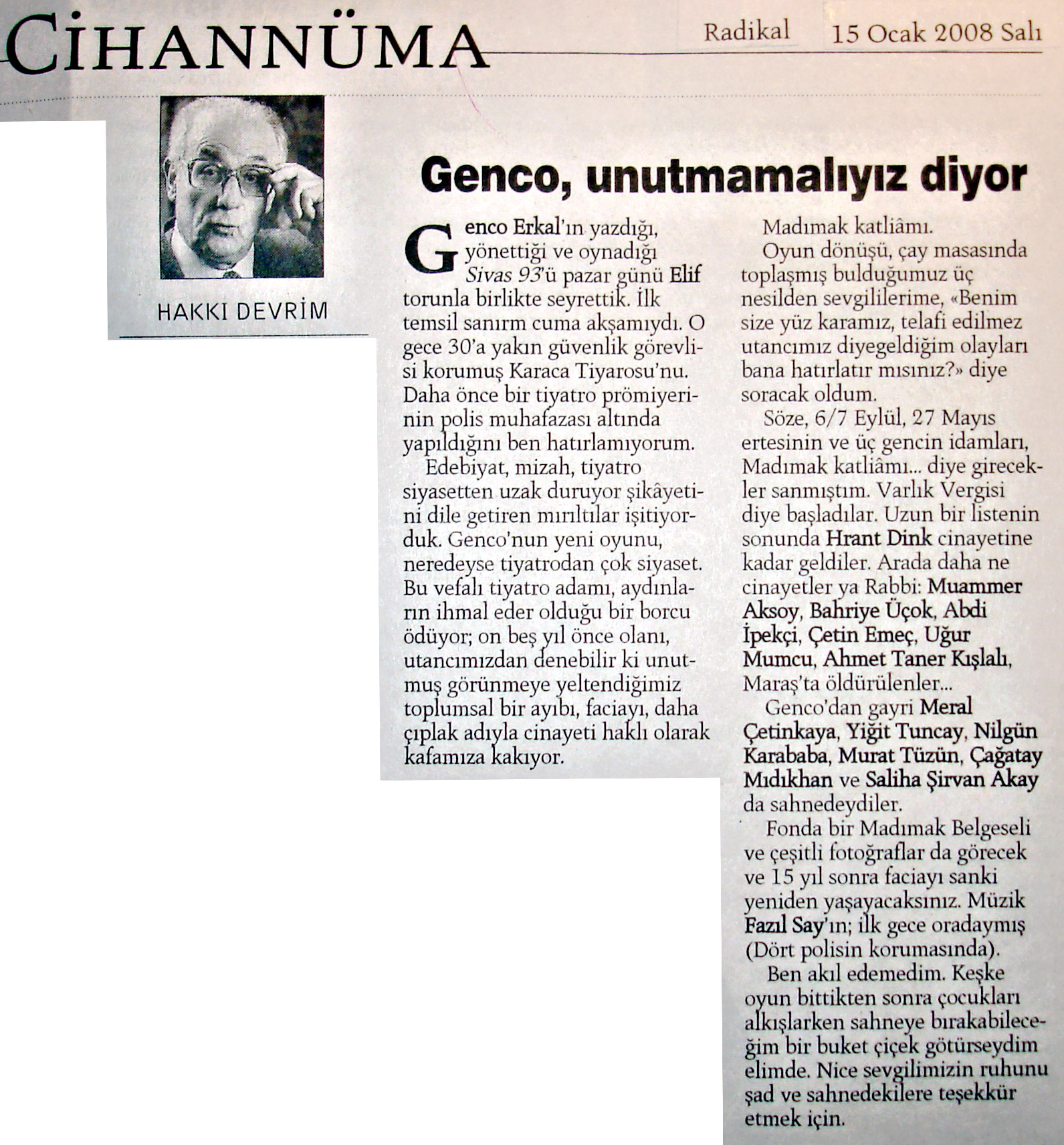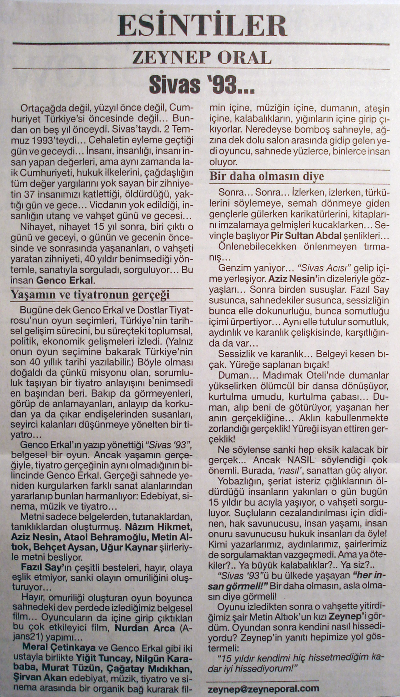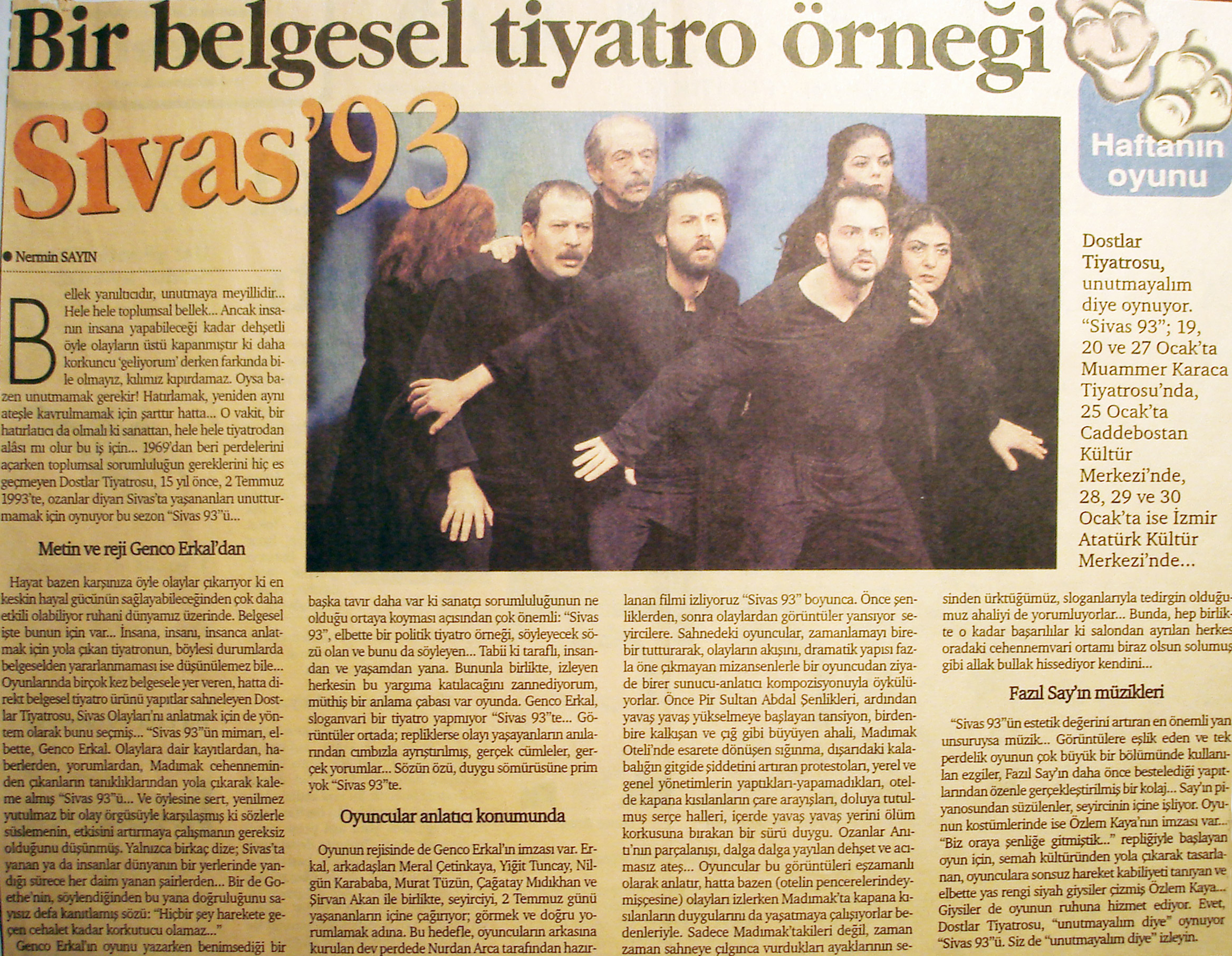 Sn. Genco Erkal nezdinde tüm sanatçılar; Dün akşam CKM’ de Sivas ’93 adlı belgesel oyununuzu izledim. Çok kısa yazacağım. Bize bu “korkunç” geceyi yaşattığınız için teşekkürler! Unutturmadığınız için, unutturmamaya çalıştığınız için… Saygılarımla;