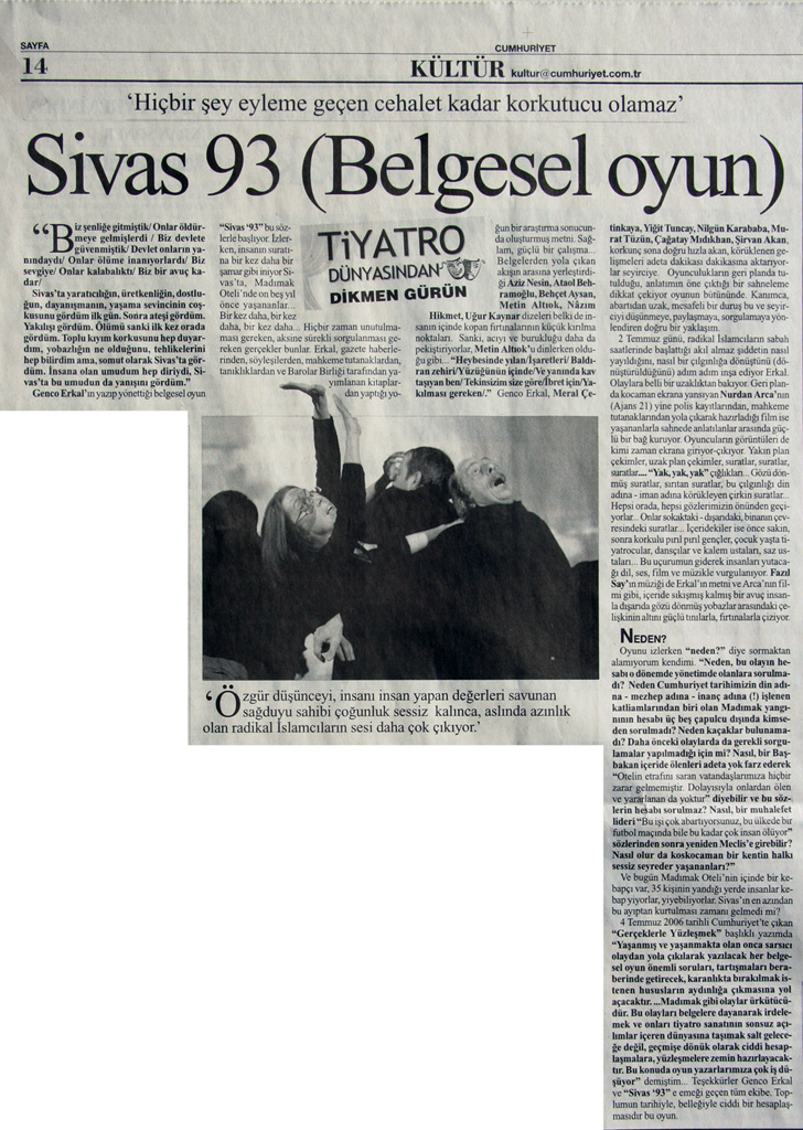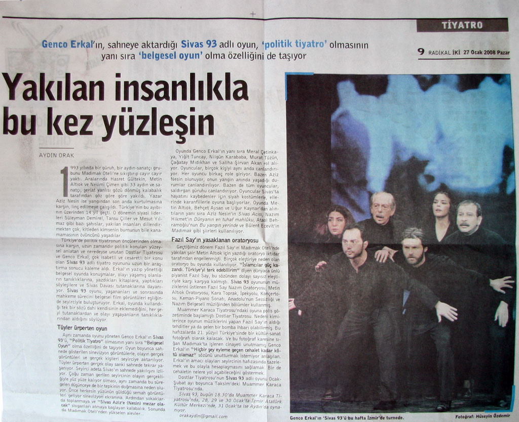 Sayin Sivas 93 Oyuncuları,15.Mart Cumartesi aksami Sinasi sahnesinde "Sivas 93" oyununuzu izledim ve cok huzunlendim, cok duygulandim, cok hirslandım. Cumleler yetmez duygularıma...Tum ızleyiciler ayni huzunle salondan ayrildi.Oncelikle, gundeme getirilmesi cesaret ve yurek gerektiren Sivas 93 oyunu için sizleri gonulden kutluyorum. "Hiçbir şey eyleme geçen cehalet kadar korkutucu olamaz" sozu hem olayin hem de oyununuzun anafikri.. Boyle bir insanlik ayibini bir daha yasamayacagimizi umarak Sayin Genco Erkal'in nezdinde tum oyunculari kutlar, saygilarimi sunarim.