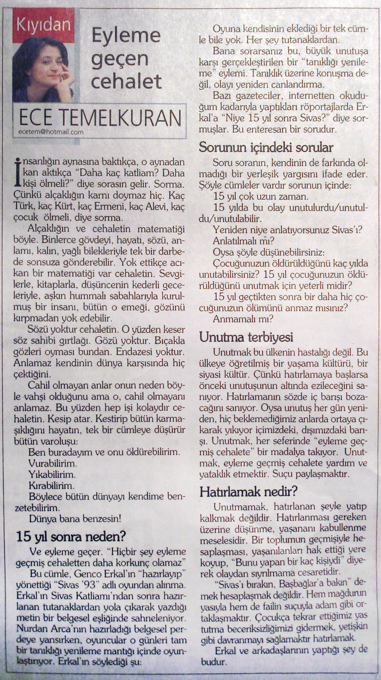 Merhabalar, Geçtiğimiz pazar günü Adana'da izledim oyununuzu ve gerçekten çok etkilendim. 2 Temmuz aslında benim doğum günüm. Ve Adana'da doğmama rağmen ilk çocukluk yıllarım babamın görevi nedeniyle Sivas'ta Divriği'de geçmiş. Ben Sivas Katliamı'nı bildiğim günden bu yana doğum günümü kutlamıyorum ve hep bu konuda, özellikle bu günde bir şey yapamamanın verdiği acizlikle rahatsızdım. Maksimum yapabildiğim duyurabildiğimce insana bu günü duyurmak oluyordu. Ama oyunun broşüründe yazan Metin Altıok'a ait serçe hikayesi benim zihnimde bir şeylerin oturmasını sağladı.Şöyle özetleyebilirim ki, bu yaz aylarında bir konser organizasyonu yapmak istiyordum. Daha önce de ufak tefek işler yaptım Adana'da. Ve bu etkinliği 2 Temmuz'da yapıp sadece konser etkinliği olarak bırakmamaya karar verdim. Bu konuda bana yardımcı olabilecek bazı insanlar var bağlantıda olduğum. Daha çok farklı ve azınlık bir kitleyi hedef alan rock- heavy metal organizasyonuydu fikrim ama bunu iki güne yayıp söylediğim gibi daha kapsamlı bir şeyler olsun istiyorum. İngiltereli, kurulduğu günden bu yana geçen yirmi küsür senede tavrından taviz vermeyen anti faşist grup Napalm Death'le görüşme hâlindeydim bu sene içerisinde. Yeniden bağlantıya geçip onları Adana'da bu tarihlerde misafir etmeyi; Ankara, İstanbul, İzmir, Afyon, Kayseri, Bursa gibi yine bağlantıda olduğum ve bu etkinliğe seve seve gelebilecek grupları da bu kadroya dahil etmeyi plânlıyorum. Sadece müzik etkinliği olarak bırakmak niyetinde de değilim. Benim için maliyeti büyük olacak bir organizasyon bu ve sponsor desteği alabileceğime de inanıyorum. Sizleri de bu konuda haberdar etmek, bu organizasyonla ilgili koşullar netleştikçe bilgilendirme, uygun olursanız sizleri de misafir etmek isterim. Saygılarımla.