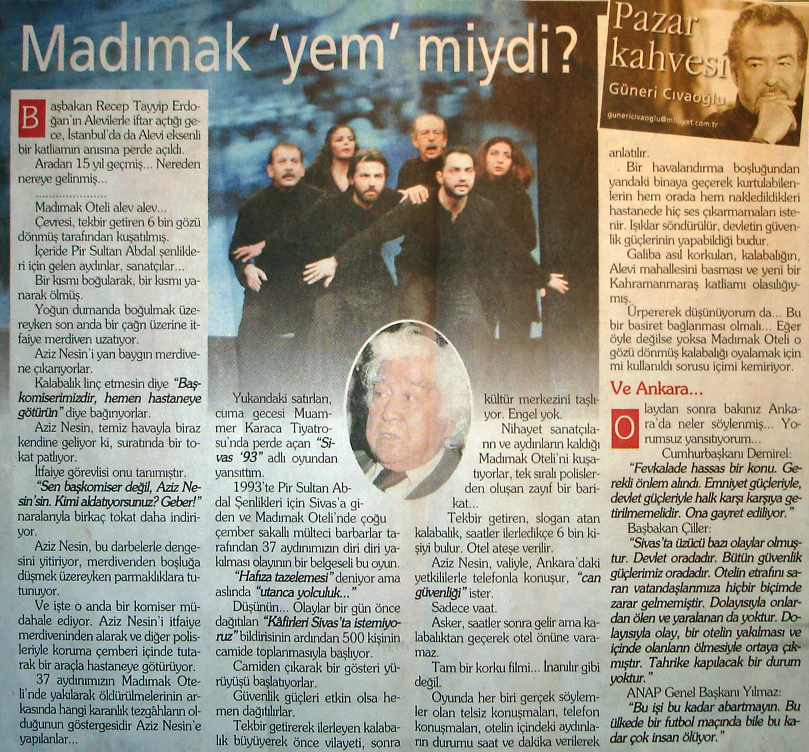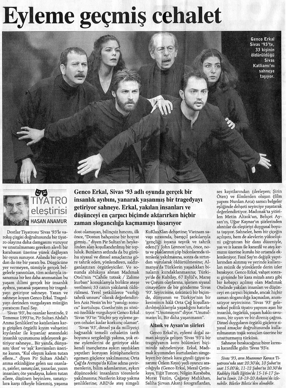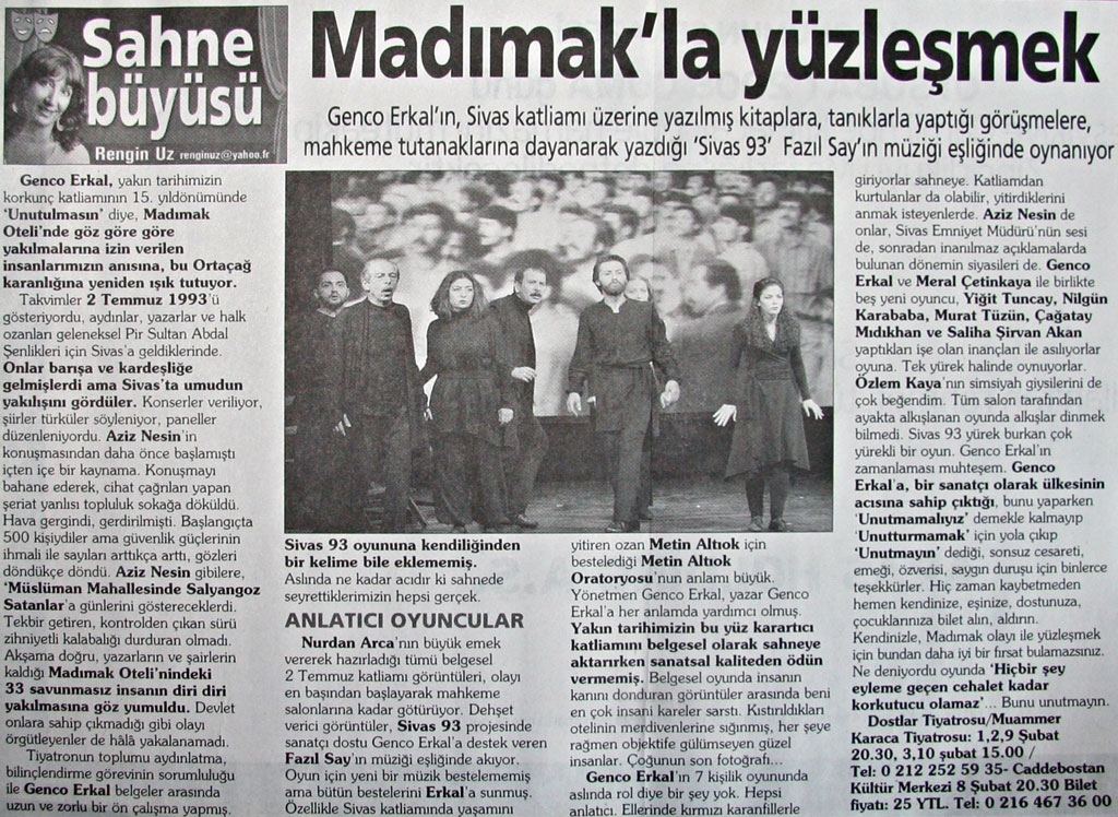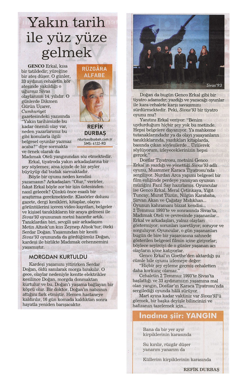 "Cehennem dediğin yerde dal, odun yoktur.Herkes ateşini kendi götürür."Pir Sultan AbdalDostlar, Genco Erkal "Dostlar"la Madımak Utancını sahnede hepimizin heyecanına davet ediyor.Yüzümüzü hala y a n g ı n ı n alazı gölgeliyor.İnsanlık düşmanı "faili m e ş h u r l a r " utanmadan hala ülkeyi çekip çeviriyorlar.Yüzümüz kızarıyor, bu ağırlıktan bir nebze paylaşımla soğutabiliriz gönlümüzü, arınırız toplumsal vebalden belki...Sahnelenen oyunu bir de "Dostlar"dan izleyin!Metin Altıok ve tüm kayıplarımız üzerimizde esen insancıl dizeleriyle gönenir, metin insanların varlığıyla avunur belki; n e d e r s i n i z ?..Dostlar; tiyatromuz İstanbul'daki oyunlarını sürdürdüğü günler boyunca h e p i m i z e öneriyorum:Profil fotoğraflarımızı "Sivas ' 93 " afişine dönüştürelim. Ne dersiniz..?Jüri de , Afife Jale'nin kemiklerini sızlatacak bu abuk kararı verirken nasıl oylamış, oooyyy,oooyyy !Diğerlerinin "hafif"letici nedenleri olabilir, de...Nedret Güvenç ne yönde oy kullandı acaba "Dostlar'a- Sivas 93'e " mansiyon biçilirken..?