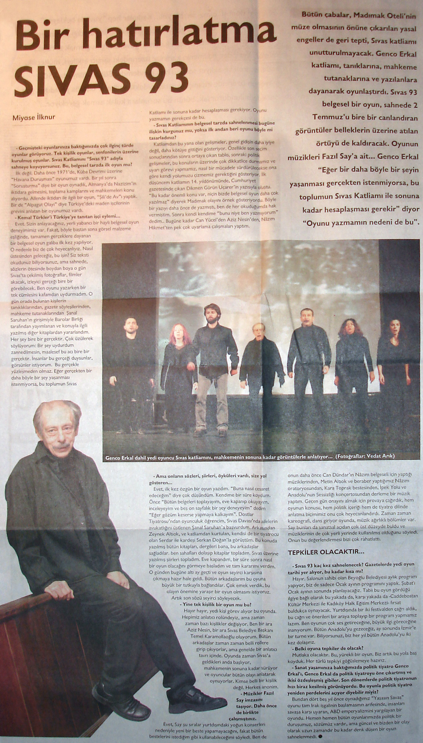 herkese merhaba. öncelikle oyunu yazan ve oyunda oynayan Genco Erkal'a sonsuz kere teşekkür ederim. Sivas 93 ile kanayan yaramıza bir nebze olsun parmak bastı Genco Erkal. Oyundaki tüm oyunculara da sonsuz teşekkür ederim. umarım sivas 93 sivas katliamını konu alacak olan tiyatro oyunları ve sinemalar için bir klavuz olur. artık bu kan akıp gitmesin. haykıralım tüm dünyaya haklılığımızı. nasıl rambolar, piyanistler, yaşamak güzeldir'ler çekiliyorsa sivas katliamını konualan sinemalar da çekilsin. Son olarak bişey eklemek istiyorum. belki benim o anki pisikolojimden kaynaklanıyor olabilr ama ben tam olarak bir duygu yoğunluğu yakalayamadım. tekrar diyorum belki eksiklik bendedir ama o yoğuluğu yakalayıp kendimden geçmek istiyordum. tekrar teşekkür ederim.