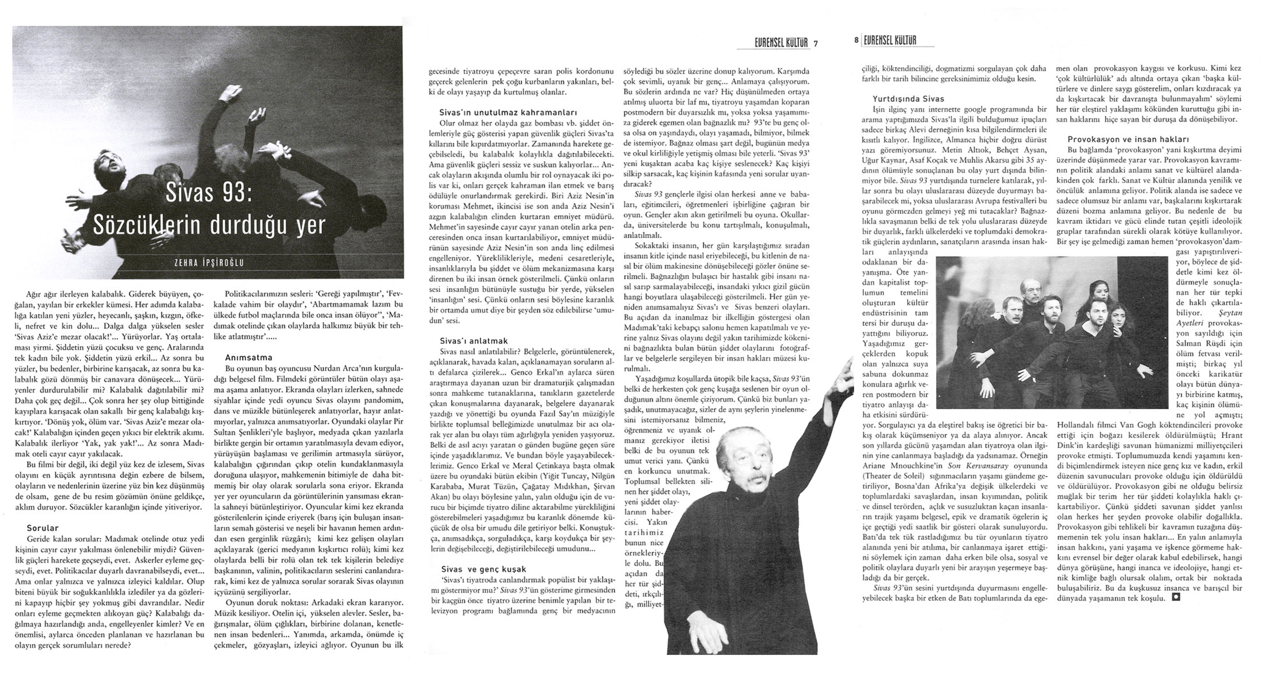 Bazı ritüellerin yaşanması doğal haliyle sürerken, onların bir damla kanla kirlenmesi insanda değişiklikler oluşturur. Sivas Katliamı’nın üzerinden onca yıl geçmesine karşın aklımıza imgelenen en önemli nokta oraya gidenler arasında gençlik yıllarını semahla örenlerin varlığıdır. Onca yazarın, sanatçının, ozanın, aydının, örgüt yöneticisinin gidip de kaldığı Madımak Oteli’nde semah dönenlerin, yakıldıkları ateşte karanfiller gibi kızıllaşarak açmalarıdır aklımızda bize simge kalan.Sivas’ta 93’te yapılan etkinliklerin ilk günü tüm katılanların sevinç ve coşkuları arasında sürer. Herkes o günün nasıl da güzel başladığını anlatır. Ya ikinci gün. O 2 Temmuz gününü nasıl anlatıyorlar. Birden bire öğlen saatlerini yüzümüze vura vura hatırlatan güneşin yükselmesi ve öte yanda camilerin etrafında biriken kalabalıkların haykırışları. Bu haykırışların çoğaldıkça şiddete dönen yüzü, gün soluncaya kadar direniyor. Bu gerçek bir direnmedir. Ölümü çoğaltma direnişidir. Bir toplu kıyıma giden direniş. İnsana olan umudun gittikçe tükendiği bir direniş. Kurban ve ateşin birleşmeye, çoğalmaya, öç almaya nefes alıp verdiği bir direniş. Sivas’ta törenler ilk gün Atatürk Anıtı’na çelenk koymayla başlıyor. Ne kadar protokol değil mi. Tam bir devlet geleneği uygulaması. Sonrası uygulamalar da böyle devam ediyor zaten. Bunda kanıksanmayacak bir şey yok. Devlet bir yerde bir etkinlik yapacağı zaman böyle başlar. Bu etkinliklere çoğunlukla polis telsizleri eşlik eder. Tıpkı Sivas’ta olduğu gibi.Bir tiyatro oyunu olarak izlerseniz bunu, karaografide tüm bir Sivas’ı görmek mümkün olmaz elbette. İşte bu nedenle başvurulacak şey belleklerimizden çıkmayan görüntülerdir. Bu görüntüler ne yazık ki katliamın tanığı olmaktan öte bellektir bize, insanlığa. O bellekler de kendimizi unuttuğumuz an, hatırlatmak içindir. Sadece sahne olarak bakarsanız 3 kadın 4 erkek görürsünüz tiyatro sahnesinde. Bu sahneyi bozan şey, birden kimsenin reddedemeyeceği görüntüleri bize sunan sinema kareleri oluverir birden. Sivas; gazete arşivlerinde birikmiş bildiriler ve yazılar, 93 Temmuz’unun ilk günlerine sığan sinema kareleri;Ankara; ve asla taraflılığından vazgeçemeyeceğimiz kişilerin açıklamaları. Yani Demirel, Çiller Yılmaz, İnönü vs.ler. Sivas kareleri arasında onların adlarının ne işi var demeyin. Onlar sadece o günün değil, tüm katliam yargılaması boyunca karşımızda olanlardır. Mahkemelerin soğuk duvarlarına güç verenlerdir. Bu insanlık ayıbının karartılmasında öncelikli olarak başka kimin emeği olabilir ki o kadar.Sivas; Saat 14: 00, cami yollarından yürüyerek birikenler; “Şeriat gelecek, zulüm bitecek.” Sivas; Saat 14: 00, Kültür Merkezinden çıkanlar; “Türkiye Laiktir, Laik kalacak.”İşte o ismi geçenlerin bize adım adım sundukları Türkiye.Saatler ilerliyor. Kurtuluş umudu arayan telefon trafiği, belgelerle karelerde; Sivas-Ankara; Ankara-Sivas…. Konuşmalar ise oyuncuların ağzında; “gerekli önlemler alındı!” Asker geliyor. Polisler yeterli… Sürüyor umutlar. Polis telsizleri; “kalabalık birikti.” Karamollaoğlu konuşuyor; “gazanız mübarek olsun. Şunların ruhuna bir Fatiha okuyalım önce…” Saat: 15/16, Madımak Oteli’nin içinde tüm adı geçenler. İçerde korku yok. Bekleyiş var. Gençler türkü söylüyor. Şairler ozanlar konuşuyor; “aramızdan biri ölse ne olacak. Yanıtlıyor biri; “Geri kalanlar ölene şiir yazacak…” Kendilerini bekliyorlar anlaşılan, anlı şanlı. Yok yok Godot’u bekliyorlar. Birgün gelecek…Dışarısı daha hareketli, kameralar orada. Pir Sultan Abdal’ın heykeli otelin önünde. Müthiş bir heyecan. Kin, nefret, vecd hali; heykeli tekmeleyenler, sövenler, kafa vuranlar, ısıranlar, üzerinde tepinenler… ve gaz dökülüp yakılmaya başlanan saatler… Heykeli yakıyorlar önce; Pir Sultan Abdal’ın dilinde; “bu kaçıncı ölmem hain…”Saat 19: 20, Polis telsizinden; 3832: “Topluluk (güruh oluşturan beyefendiler) iyice/ne kontrolden çıktı…” Sivas’ta Müslümanlar yargılama ve cezalandırma hakkını kullanıyor.Saat: 19: 55, cehennem ateşi.Kitabın dediği oluyor…Z. Taşpınar: “Yakıyorlar bizi…”Saat 20: 00, Kim boğuldu, kim yandı, kim tükendi.Polis anonsları yoruldu; kin kusuldu. Sustu son cümleyle; 3830: “Madımakta yanıt yok.”Olay tamam. El Fatiha.Ortadoğudaki tüm katliamlara ortak bir bahane: Müslümanlar göreve!Sessiz belgeler çığlık atıyor, ses oyunculara kaldı. Dostlar Tiyatrosu’na.Toplu bir katliam gösterisi bitti. Sivas sokaklarına ve katledenlere her bir katlettiklerinin yüzü asılı kaldı.Dava ne zaman bitti görünüyor; 2002’de. Yer: Ankara. Adalet mülkün temelidir; önemli sanıklardan bazıları hala yakalanamadı. Bazıları milletvekili oldu. Kimisi ödüllendirildi hakkıyla.Devlet orayı katliam müzesi yapmaya korkuyor, ya da polis anonsları susmadı.Susmayan başka bir şey de tragedya ve trajediyi anlatan bitmeyen oyunlar. Belgesel tiyatro oyunu; “Sivas 93”. Biz hala oradayız, ya siz…